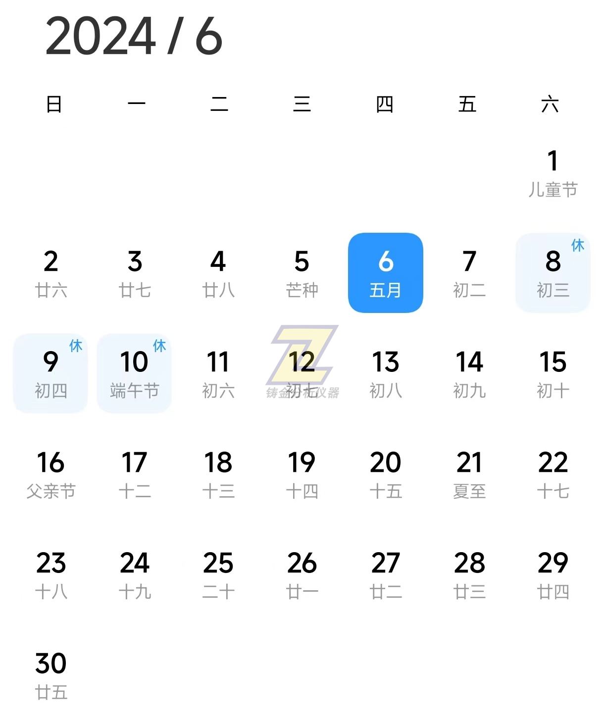 根據(jù)《國(guó)務(wù)院辦公廳關(guān)于2024年部分節(jié)假日安排的通知》(國(guó)辦發(fā)明電〔2023〕7號(hào))精神, 2024年端午節(jié)上海鑄金分析儀器有限公司放假安排如下: