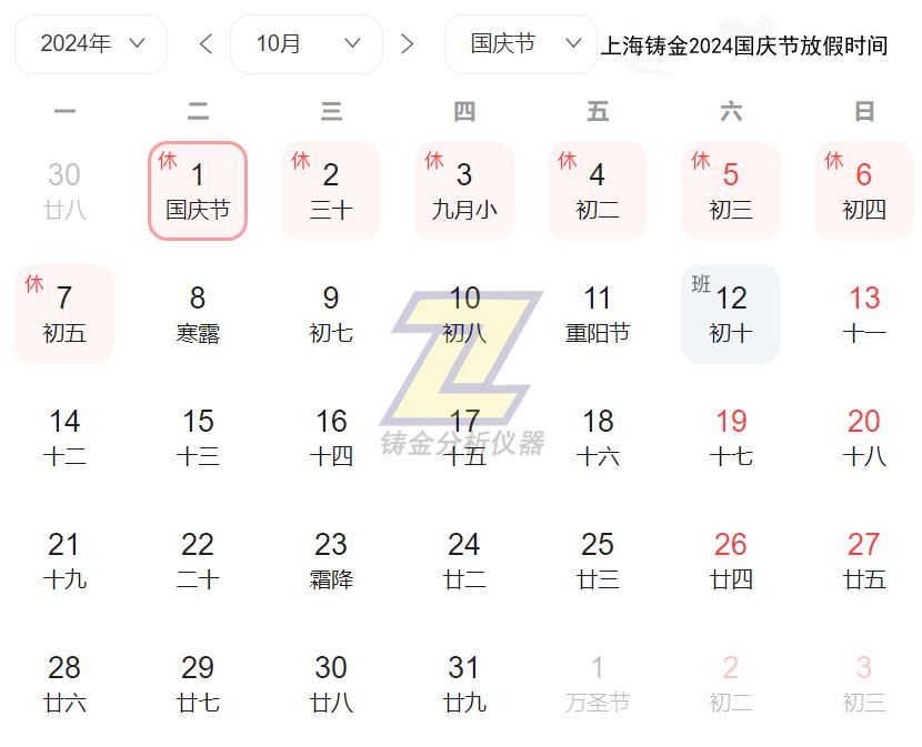 上海鑄金分析儀器有限公司2024年國慶節放假安排為10月1日至7日放假,共7天。9月29日(星期日)和10月12日(星期六)上班。