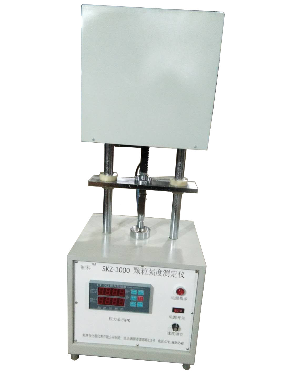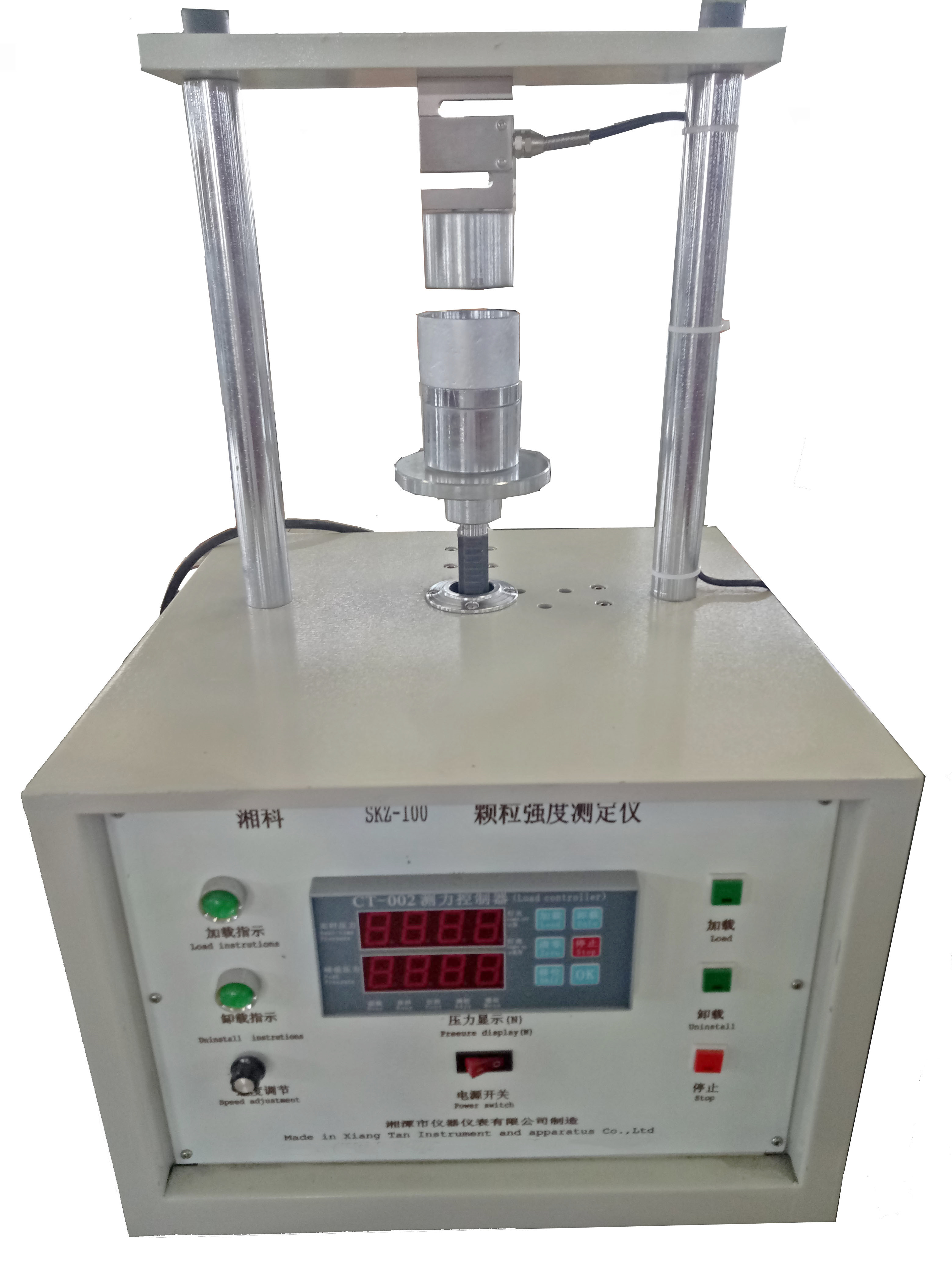該儀器采用調(diào)速電機傳動系統(tǒng),均勻加載,顯示準(zhǔn)確,重復(fù)性好,適用于顆粒活性炭等強度較小的非金屬材料的抗壓強度檢測,滿足標(biāo)準(zhǔn):GB/T30202.3-2013 脫硫脫硝用煤質(zhì)顆粒活性炭試驗方法 第3部分:耐磨強度、耐壓強度測定方法中對耐壓強度的測定。SKY-10000顆??箟簭姸葴y定儀主要技術(shù)參數(shù):1、最大載荷:10000N;2、分度值1N;3、顆粒直徑: ≤Φ30(mm)4、測量精度:誤差≤1% F.S;5、荷重精度:1%;6、工作模式:測試物料壓碎裂后,設(shè)備自動復(fù)位;7、壓柱直徑為6.1mm,下具按國標(biāo)G