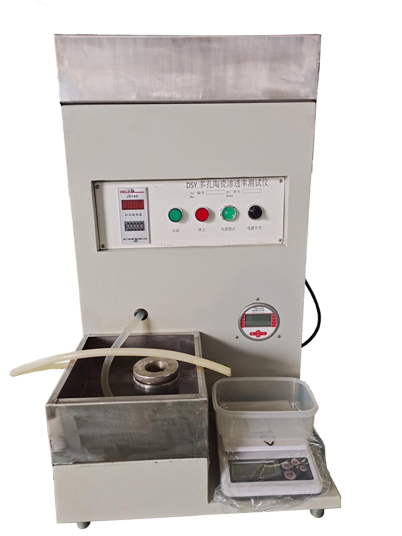 DSY多孔陶瓷滲透率測試儀適用于按GB/T1969-1996 《多孔陶瓷滲透率試驗方法》多孔陶瓷材料和制品的滲透率的試驗方法。本儀器主要由水箱、電器控制箱及試樣夾具、天平等部分組成,采用精密低量程數字測壓系統,測量試驗壓力值。試樣夾具適用于截面為圓柱形的試樣,夾具保證了在試驗過程中液體只能從試樣孔中通過而不至于從試樣邊緣泄露。多孔陶瓷滲透率測試儀DSY主要技術參數:1、試驗壓力0--5KPa可調,2、 數字壓力表測量精度:1℅,計量單位KPa,3、 標準試樣規格:直徑:Ф360.5mm,也可以根據客戶要求