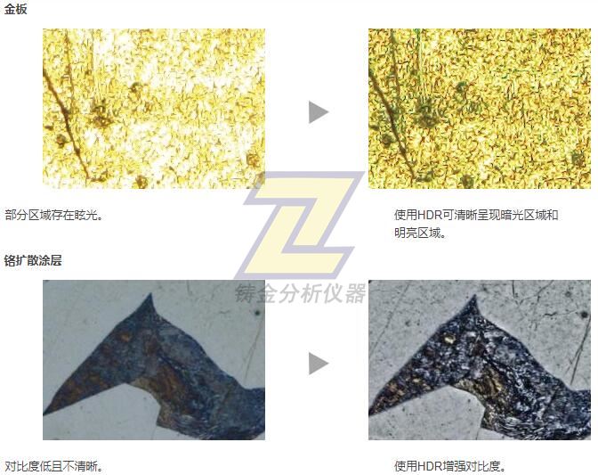 采用XJ圖像處理技術的高動態范圍(HDR)可調整圖像內的亮度差異,從而減少眩光。該功能還有助于增強低對比度圖像的對比度。HDR可用于觀察電子器件中的微小結構并識別金屬晶界。