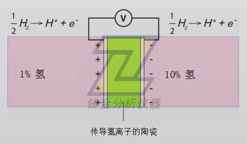 如上所示,傳導氫離子的陶瓷(綠色)的非滲透部分的兩側上涂覆有金屬電極。由于氫濃度較高,右側電子濃度高于左側。這導致右側相對左側呈現為帶負電荷。如果已知陶瓷上的電壓及一側的氫濃度(“基準”氫濃度),即可計算另一側的氫濃度。這類布置稱為“氫濃度單元”。為能使用氫濃度單元來測量氫,必須已知基準氫濃度。享有專利的“固態基準”(產生已知氫濃度的固體材料) 密封在傳感器內以影響該基準。因此,與固態基準接觸的電極為“基準電極” 且與被測氣體接觸的電極為“測量電極”。