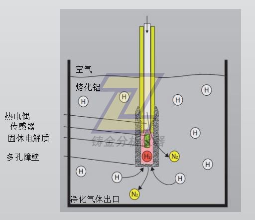 以下示意圖顯示在熔化鋁的氫濃度測量期間探針的布置。在探針的末端,有一個多孔的擴散屏障。熔化金屬中溶解的氫離開溶液且在測量腔室內形成氫氣,如圖所示。氫濃度單元的測量電極與該氣體接觸。測量來自氫濃度單元的電壓且由于已知基準氫濃度,即可計算測量腔室中氫氣的濃度。為得出熔化金屬中的氫濃度,必須已知氫的溶解度。氫在純鋁中的溶解度取決于溫 度。因此,還必須測量熔化金屬的溫度以便計算溶解的氫含量。氫溶解度還取決于熔化金屬的合金成分。有鑒于此,對分析儀內對溶解度系數進行調節以進行相應地補償。